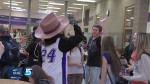 His first stop from the airport was Lehi High School, where he wore the Pioneer Pete mascot suit to surprise his 16-year-old sophomore daughter, Bailee.