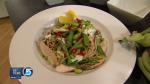 6. Sauté for 2 minutes, add asparagus, peas, artichokes and roasted red pepper. Sauté just until heated. Add basil and parsley.