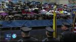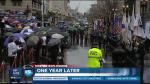 After the tributes, many of those in attendance walked in the rain to the finish line for a moment of silence that coincided with the time when the bombs went off. Bells rang, and a flag was raised by transit agency police Officer Richard Donohue, who was badly injured during a shootout with the bombing suspects.