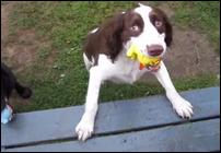 The skill and joy Charcoal displays when playing with his bucket is beautiful to behold. At one point, Charcoal flips the bucket and catches it on his head. Then he runs around for a bit before coming to sudden stop so the bucket slides off his head, and he catches it with his mouth before it hits the ground.