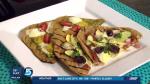 11. Pull dough off grill onto cutting board and on grilled side place sauce and toppings.