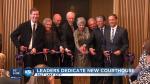 Stewart and Hatch joined federal judges and officials, the architect and general contractor in the George Sutherland Courtroom to cut the ribbon on the $185 million building at the corner of 400 South and West Temple.