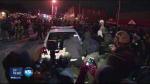 The crowd with her erupted in anger, converging on the barricade where police in riot gear were standing. They pushed down the barricade and began pelting police with objects, including a bullhorn. Officers stood their ground.