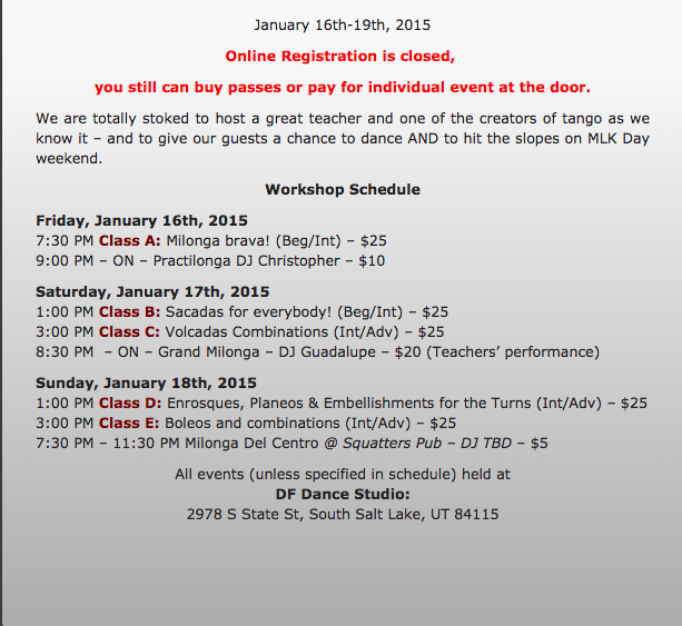 Si desea participar este fin de semana de las milongas o clases en la que los instructores serán Fabián y Lola, puede visitar la pagina wasatchtango.org en donde encontrará los detalles de este evento que culmina el Domingo por la noche.