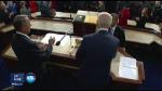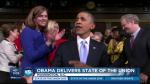 The president sought out more common ground on foreign policy, pledging to work with Congress on a new authorization for military action against the Islamic State group in Iraq and Syria, as well as legislation to guard against cyberattacks. In a rare move away from his own party, Obama also renewed his call for fast-tracking free trade agreements with Asia and Europe, generating more applause from pro-trade Republicans than skeptical Democrats.