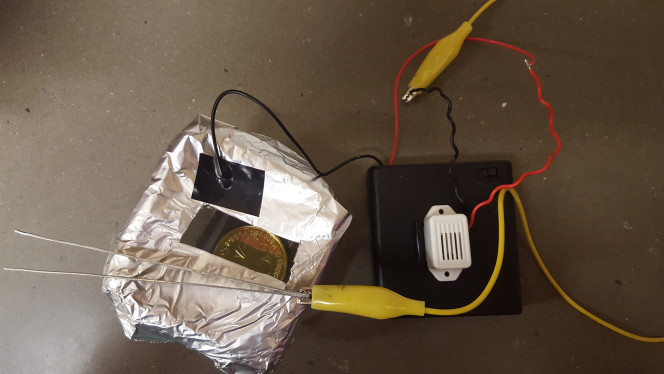 Once you have all your terminals connected, your experiment should work. Touch the tweezers attached to one alligator clip to the foil in the box. Do you hear it buzz?