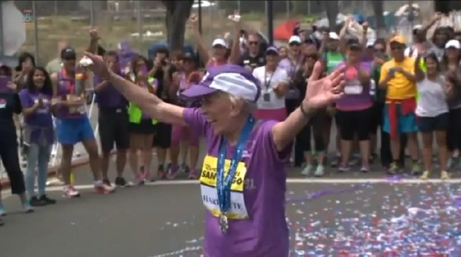 The Charlotte, North Carolina, native became the oldest woman to complete a marathon when she crossed the finish line Sunday at San Diego's Rock 'n' Roll Marathon after 7 hours, 24 minutes and 36 seconds.