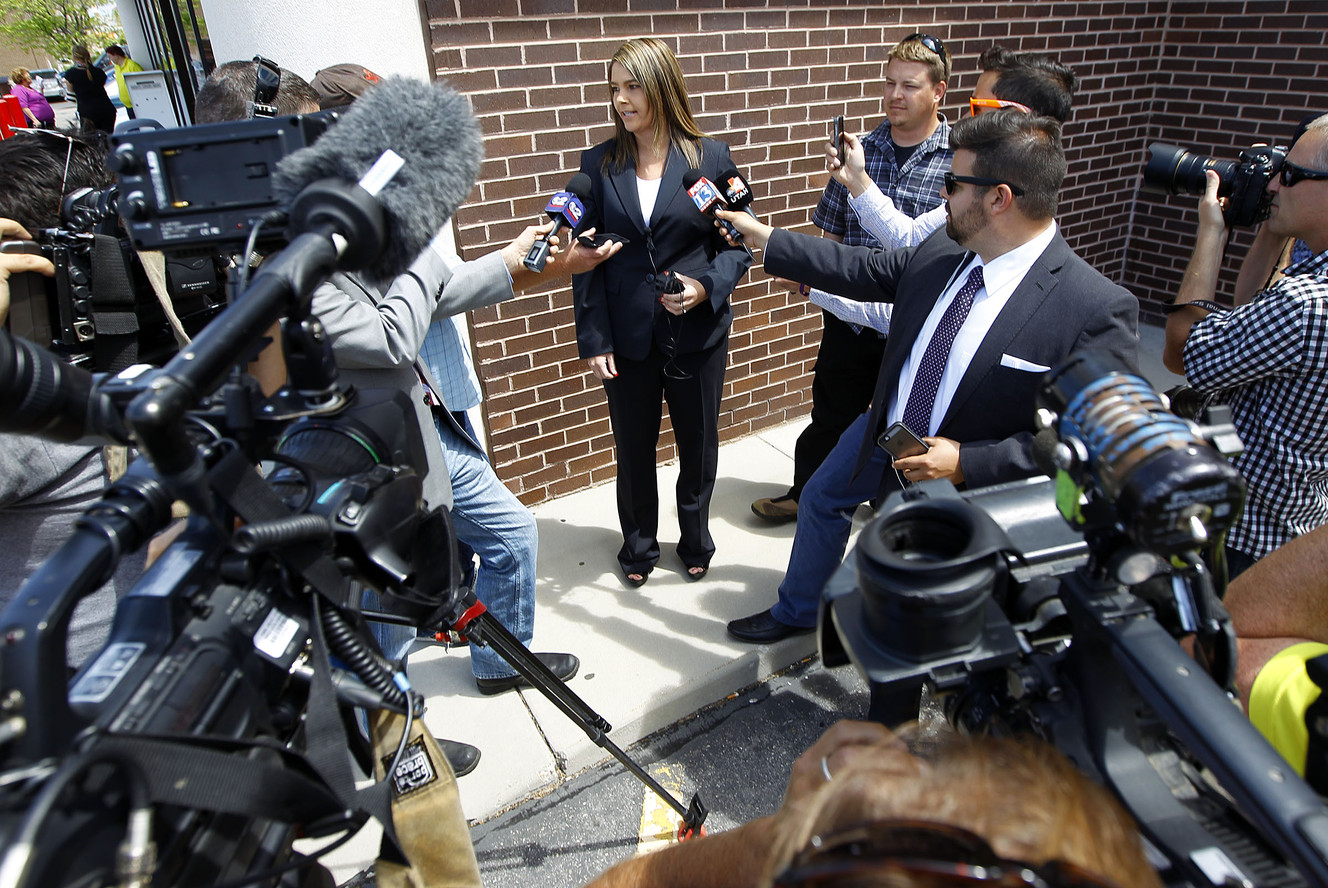 Attorney Lindsay Jarvis answers media questions on behalf of her client Shaun Cowley at the West Valley City Justice Court in West Valley City, Wednesday, June 3, 2015. (Chris Samuels/Deseret News)