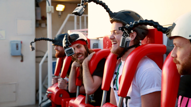 Eastin said he strapped GoPro cameras to each of the four band members and captured their reactions while they were plummeting on the 855-foot drop. He said the bassist, Ben McKee, was terrified during the ride and Reynolds asked Eastin to include outtakes at the end of the video.