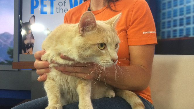 George is a 3-year-old buff tabby cat with beautiful golden eyes. He’s a mellow, easy-going sort of fellow, according to Temma Martin from the Best Friends Animal Society. George also loves children and likes other cats.