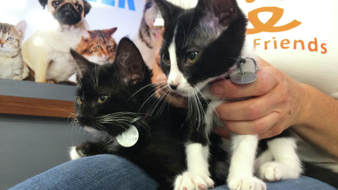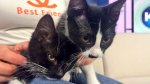 Temma Martin said she doesn’t think they kittens are siblings, but they may as well be with their similar markings. Tesla is mostly black with a little white “beard,” and Sandy is more white with a little black “mustache.”