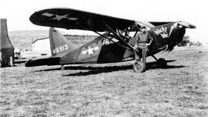 The 173rd Liaison flew Piper L-4 Cubs, Twin Cessna UC-78's and Stinson L-5 Sentinels — the plane Noble flew the most. In fact, Noble christened his L-5, "the Wacky WAC" in honor of his wife, Marty.