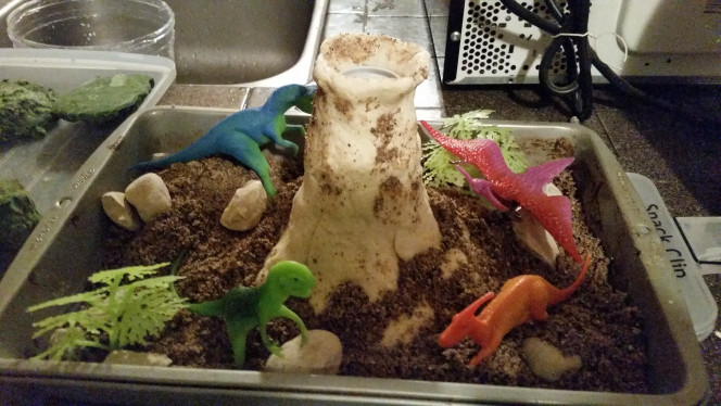 The experiment: Our volcano was made of salt dough surrounding a plastic container. Fill the container part-way with baking soda and place the volcano in the middle of a Dollar Store dinosaur country. Add vinegar to the volcano and watch the bubbles spew up and over the volcano, then flow like hot lava and cover the landscape.