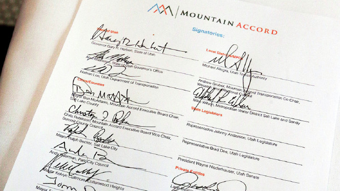 Gov. Gary Herbert joined elected officials and local stakeholders Monday in officially signing the Mountain Accord — a 16-page document that represents the consensus positions of policymakers and community leaders working to develop a long-term plan to manage transportation and conservation interests in the central Wasatch Mountains while also balancing the protection of water and land resources with projected population growth and economic expansion.