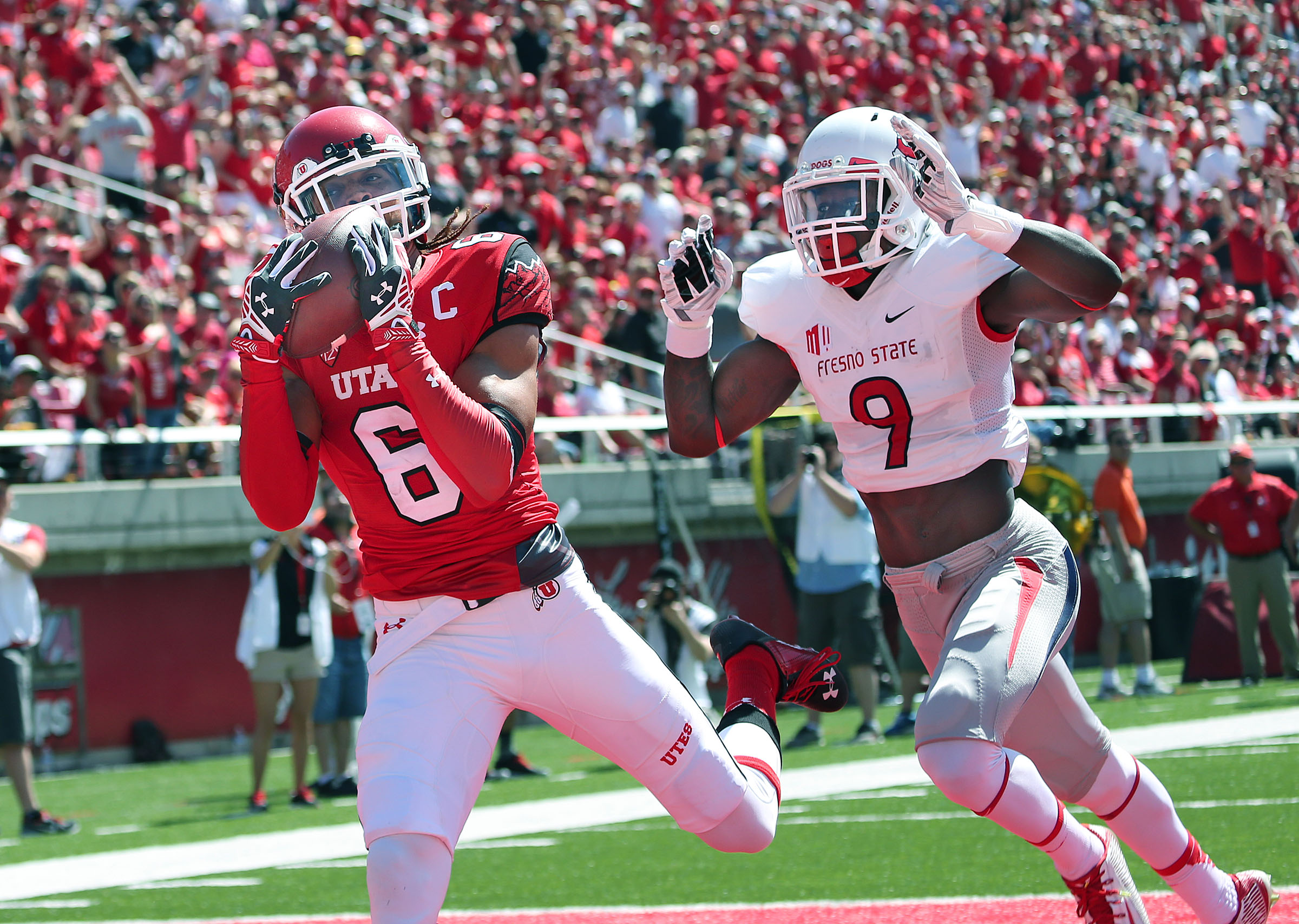 Utah Utes wide receiver Dres Anderson (6) catches a touchdown over Fresno State Bulldogs defensive back Curtis Riley (9) as the University of Utah plays Fresno State in NCAA football Saturday, Sept. 6, 2014, in Salt Lake City. Tom Smart Deseret News