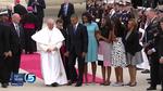 He was welcomed by a military honor guard, chanting schoolchildren, politicians, and Roman Catholic clerics in black robes and vivid sashes of scarlet and purple. Joe Biden, the nation's first Catholic vice president, and his wife were among those who greeted him.