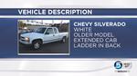 The truck is described as an older white Chevy Silverado extended cab with a ladder and a hammer in back. It also had Chevrolet logos on the hubcaps and a tinted back window.