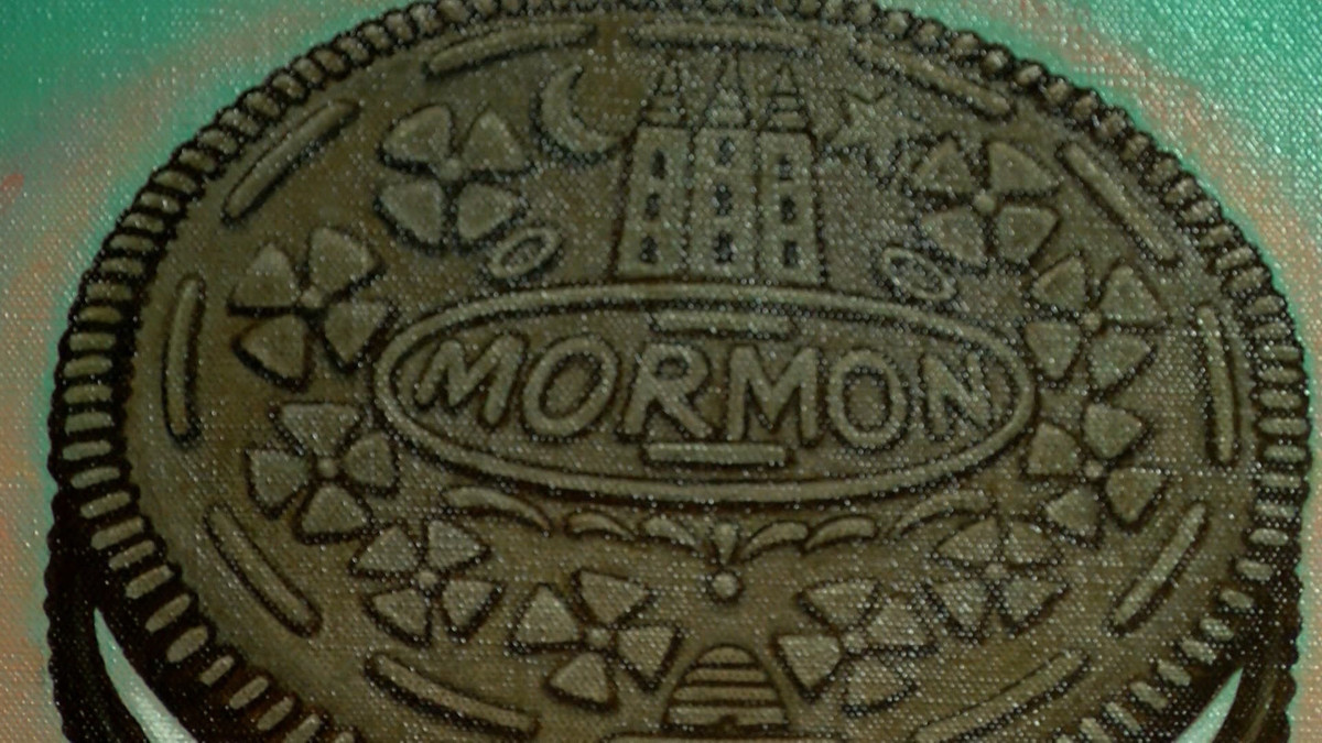 Now he makes his living painting sweets ranging from Rice Krispies Treats to gummy bears to Pez to stacks of green Jell-O. There are references to art, like a Spiral Jetty made out of spiral taffy. There are references to religion: mandalas made out of ice cream cones and slices of pie. He painted a reference to the Eucharist. Instead of wine and bread, there's a glass of milk and an Oreo. The letters on the cookie in the characteristic Oreo font spell "Mormon."