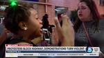Demonstrators chanted "release the tape" and "we want the tape" while briefly blocking an intersection near Bank of America headquarters and later climbing the steps in front of the city government center. Later, several dozen demonstrators climbed onto an interstate highway through the city, but they were pushed back by police in riot gear.