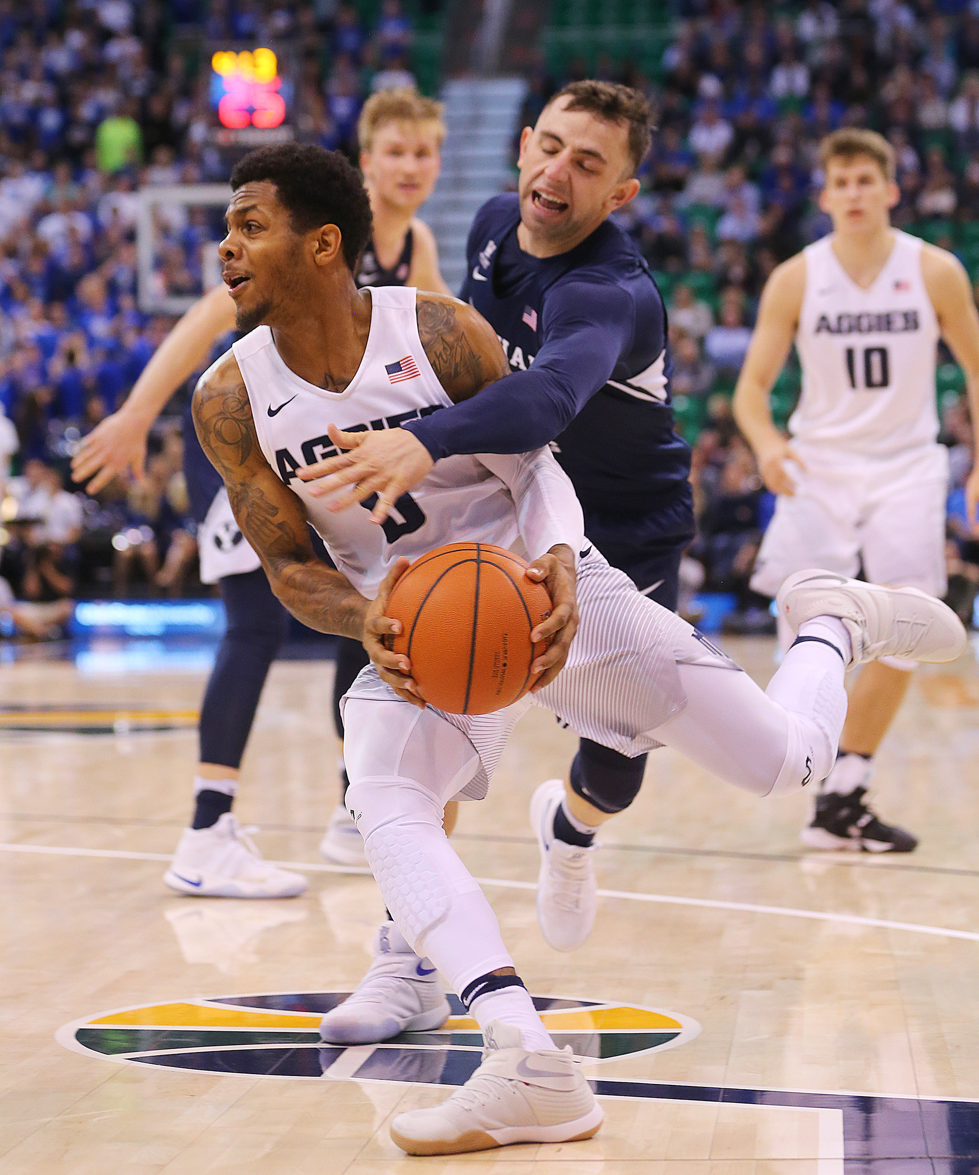In the second half with BYU leading 38-35, Davin Guinn missed a 3-point attempt but got his own rebound and kicked it out to Nick Emery, who missed a 3-point attempt. However, L.J. Rose got the offensive rebound and Davin Guinn missed another 3-pointer in the possession. Rose picked up his second offensive rebound and found Emery for a long 3-pointer to finally finish off the long possession. It was a summary of what the night was like for the Aggies.