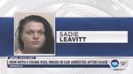 Sadie Shantell Leavitt, 25, was booked into the Utah County Jail for investigation of two counts of drug distribution in a drug-free zone, three counts of child endangerment, evading police, possession of drug paraphernalia in a drug-free zone, driving on a suspended license and DUI, as well as other seat belt and equipment violations.