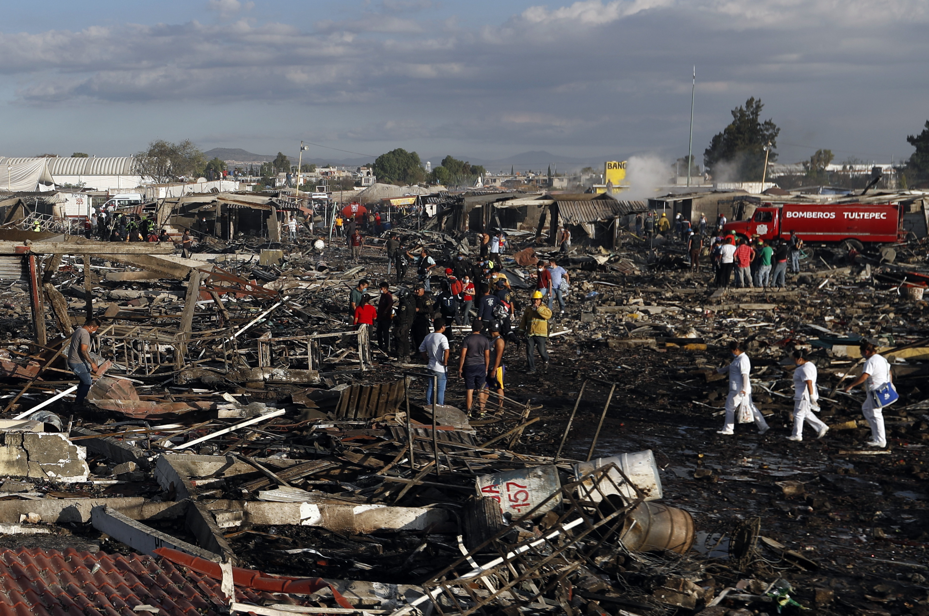 TULTEPEC, Mexico (AP) — A powerful chain-reaction explosion ripped through Mexico's best-known fireworks market on the northern outskirts of the capital Tuesday, killing at least 29 people, injuring scores more and sending a huge plume of charcoal-gray smoke billowing into the sky.