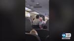 A male passenger stands up and intervenes, apparently upset with how the woman's situation was handled. He tells the flight attendant, "Hey bud, hey bud. You do that to me, and I'll knock you flat."