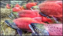 Kokanee salmon are the landlocked strain of the sockeye salmon, which run to sea before spawning. Kokanee spawn largely in tributary streams and can be easily seen in the fall when they sport their bright red color with green heads. Other than spawning season, kokanee typically have a blueish green back that is offset by silvery sides and a slightly forked-tail.