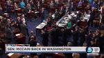 A few minutes earlier, McCain dramatically entered the chamber for the pivotal vote, his first since surgery and his cancer diagnosis in Arizona. Unified for once, Republicans and Democrats applauded and whooped for the six-term lawmaker. "Aye," he said, thumbs up with both hands, for the GOP vote to move ahead on debate.