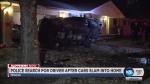 There were no known serious injuries to anyone in the cars or the house. The occupants of the vehicles ran off after crashing.
