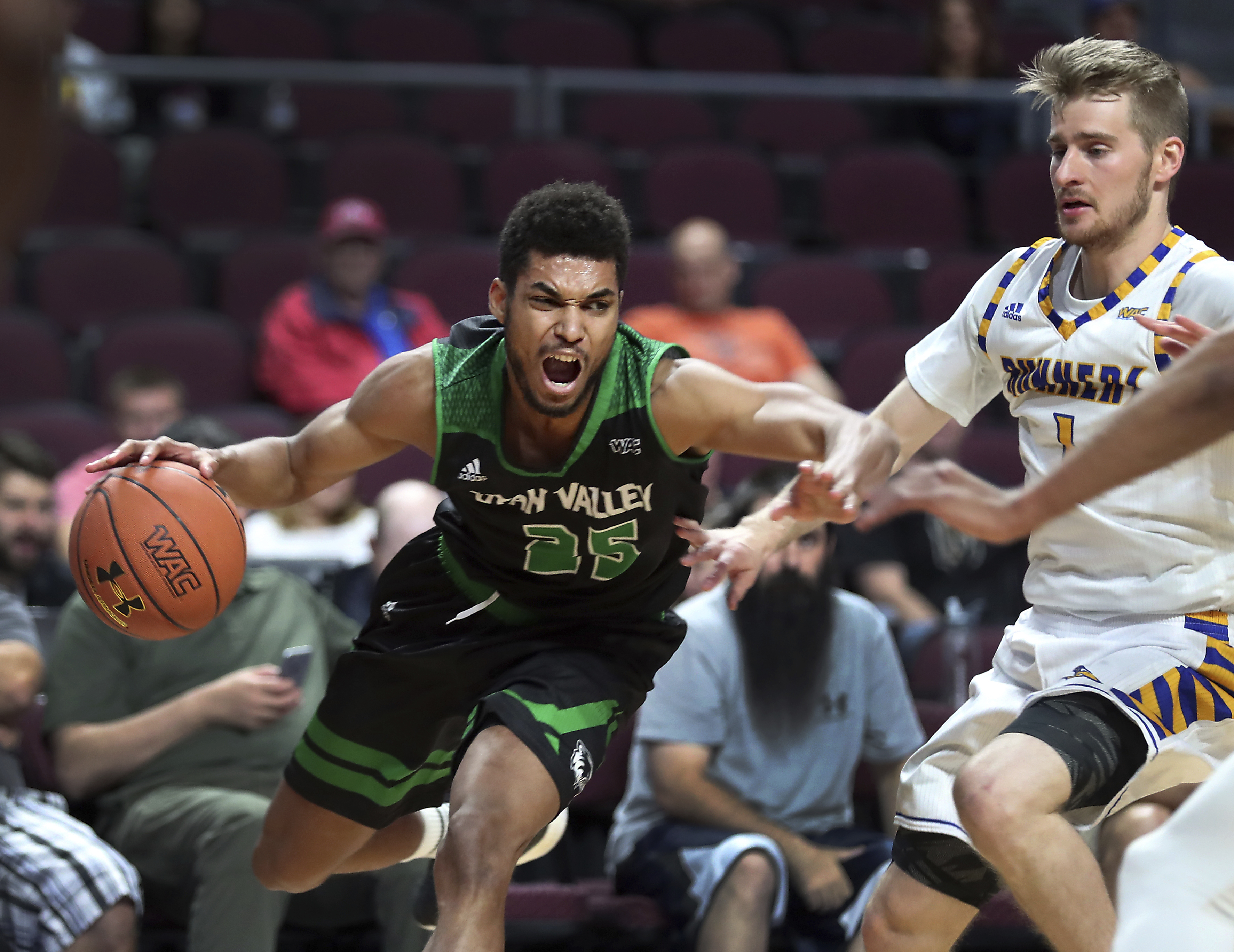 Ogbe took off down the lane and threw down a two-handed dunk in traffic that gave UVU a 34-25 lead with 17:50 to play.