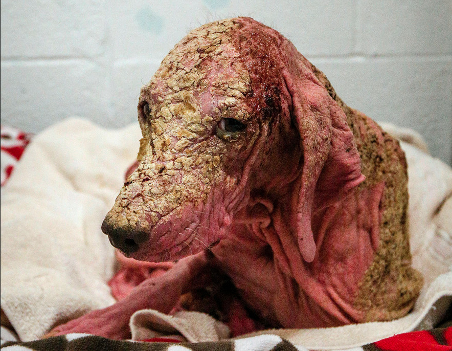 The shelter has been treating Kelly's sarcoptic mange with medication, and Oulson says the "crusty, scabby" stuff that covered much of her skin has fallen off. In two more weeks, she should no longer be contagious, after which she can go out on her first walk in a while.