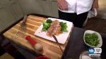 Drizzle chipotle mayonnaise and wasabi cream over salmon, garnish with green onion and sesame seeds.