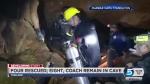 MAE SAI, Thailand (AP) â Expert divers Sunday rescued four of 12 boys from a flooded cave in northern Thailand where they were trapped with their soccer coach for more than two weeks, as a dangerous and complicated plan unfolded amid heavy rain and the threat of rising water underground.