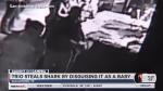 The surveillance footage shows a man plucking the shark from the tank and carrying it away, off camera, still dripping water. Another man is then seen depositing a blanket-wrapped item into a stroller and walking off, accompanied by the first man and a woman carrying a child.