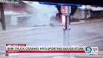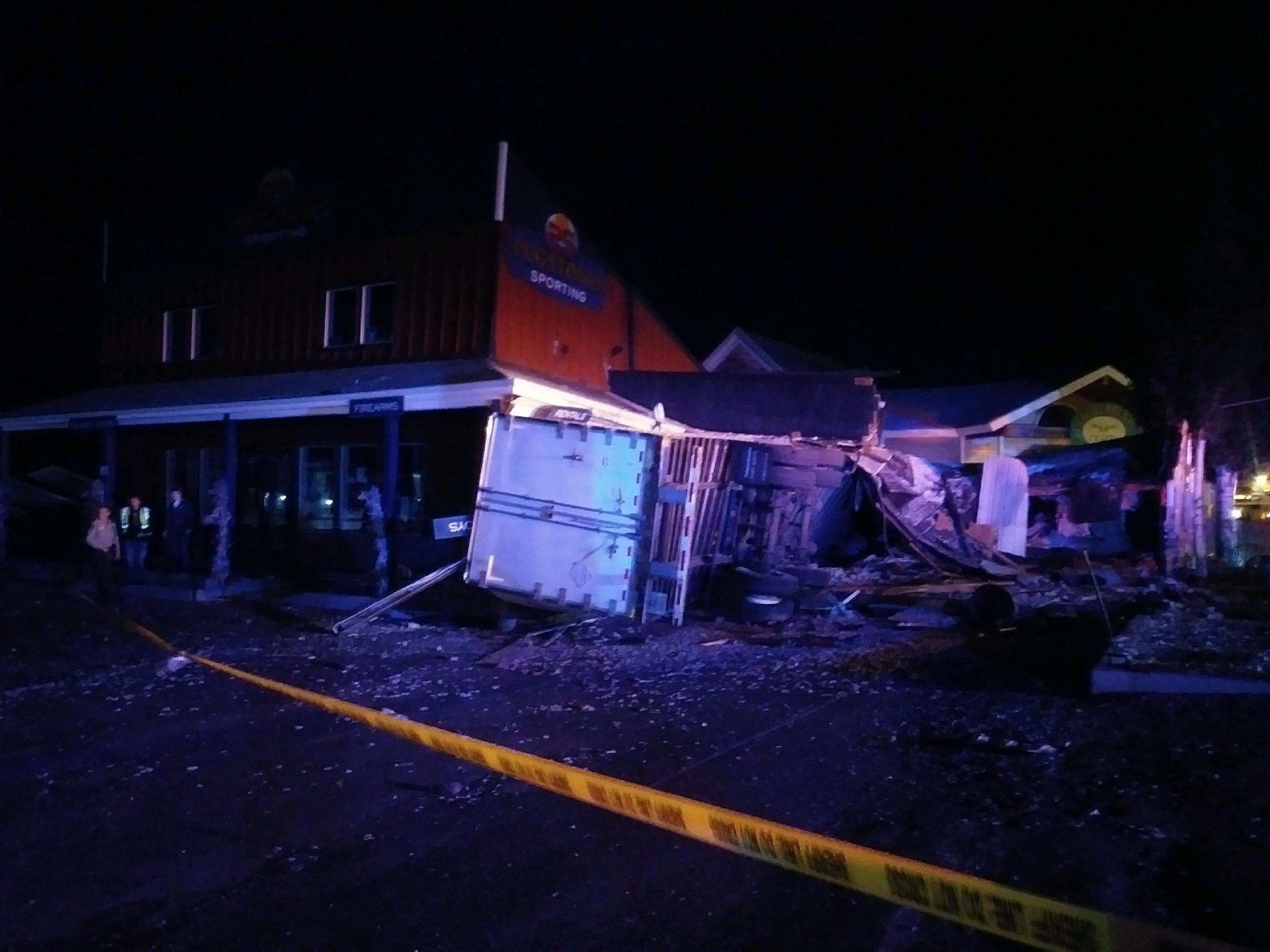 The semi, which had a refrigerated box-style trailer attached, then rolled and jackknifed into a sporting goods store in Raspberry Square, troopers said.