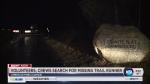 Volunteers planned to resume searching for Jenkins at 7:30 a.m. Saturday after taking a break during the night.