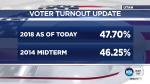 An update released Monday evening by the Utah Elections Office shows that 47.7 percent of registered voters have voted — totaling 667,302 ballots. In 2014’s midterm election, Utah ended up with a voter turnout of 46.25 percent.
