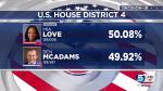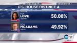 The race is now split 50.08 percent for Love and 49.92 percent for McAdams.