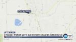 MORONI, Sanpete County — A woman who drove her car into a front porch in Moroni was arrested Sunday for investigation of DUI.