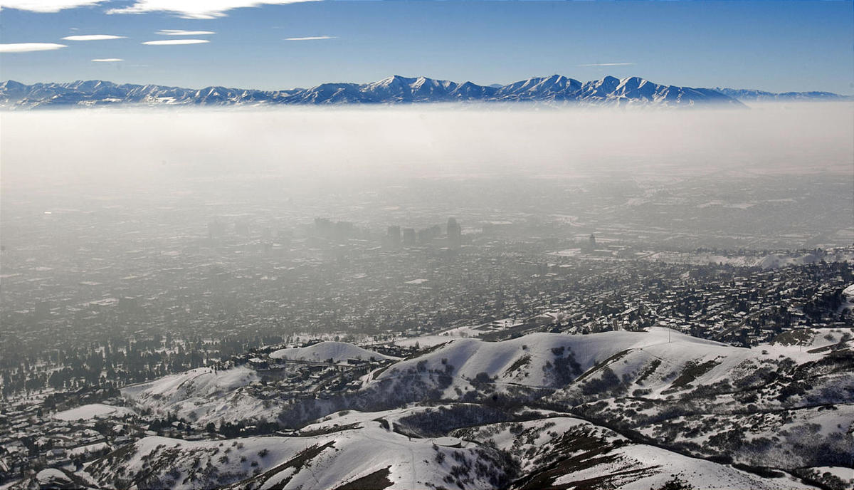 Inversions hover over Salt Lake City as cold, stagnant air settles in the bowl-shaped mountain basins, trapping automotive and other emissions that have no way of escaping to create a brown, murky haze.