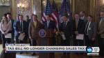 The latest version of the bill that surfaced an hour before the news conference would have eliminated local sales taxes on services and kept those rates intact so municipalities wouldn't see a change in revenue.