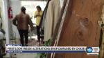The business is now boarded up; the interior walls, along with dresses, shirts and other clothing, are riddled with bullet holes. Shattered glass covers the floor. The little shop looks like an explosion went off inside.