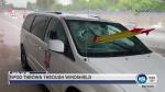 The driver of the van, Tim Page, tells KCRA-TV that he was on Interstate 5 Thursday morning when the yellow-and-red tripod smashed through the glass. He says it went through his passenger's lung and popped out.