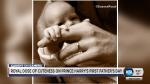 The sepia-toned photo, posted Sunday on the royal couple's Instagram feed, shows the baby cradled in Harry's arms and clutching his father's finger.