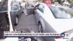 “Hey, you’re supposed to be in the lane,” the driver of the sedan says.