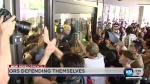 Several protesters are linked together through tubes that they've stuck their arms into. As police attempt to un-link them, at least one person yells that the officers are hurting them. The officers eventually figure out the mechanics of the tubes and are able to remove protesters' arms, apparently without significant pain on the part of the protesters.