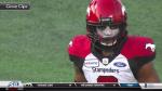 He put the mask on full display with a couple of big plays for the Stampeders, including the interception above. The makeup showed through his helmet at times, and was thick enough that he still wore it during his postgame interview — despite playing (and sweating) through most of the game.