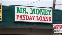 Loans for Less occupies a bungalow south of Salt Lake City. A bold yellow banner outside declares the company offers the “lowest rates” with “no credit check.”