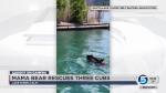 In the video, the mama bear can be seen coaxing one of the cubs to jump into the water. She then swims over, has the cub latch onto her back and swims them both to safety.